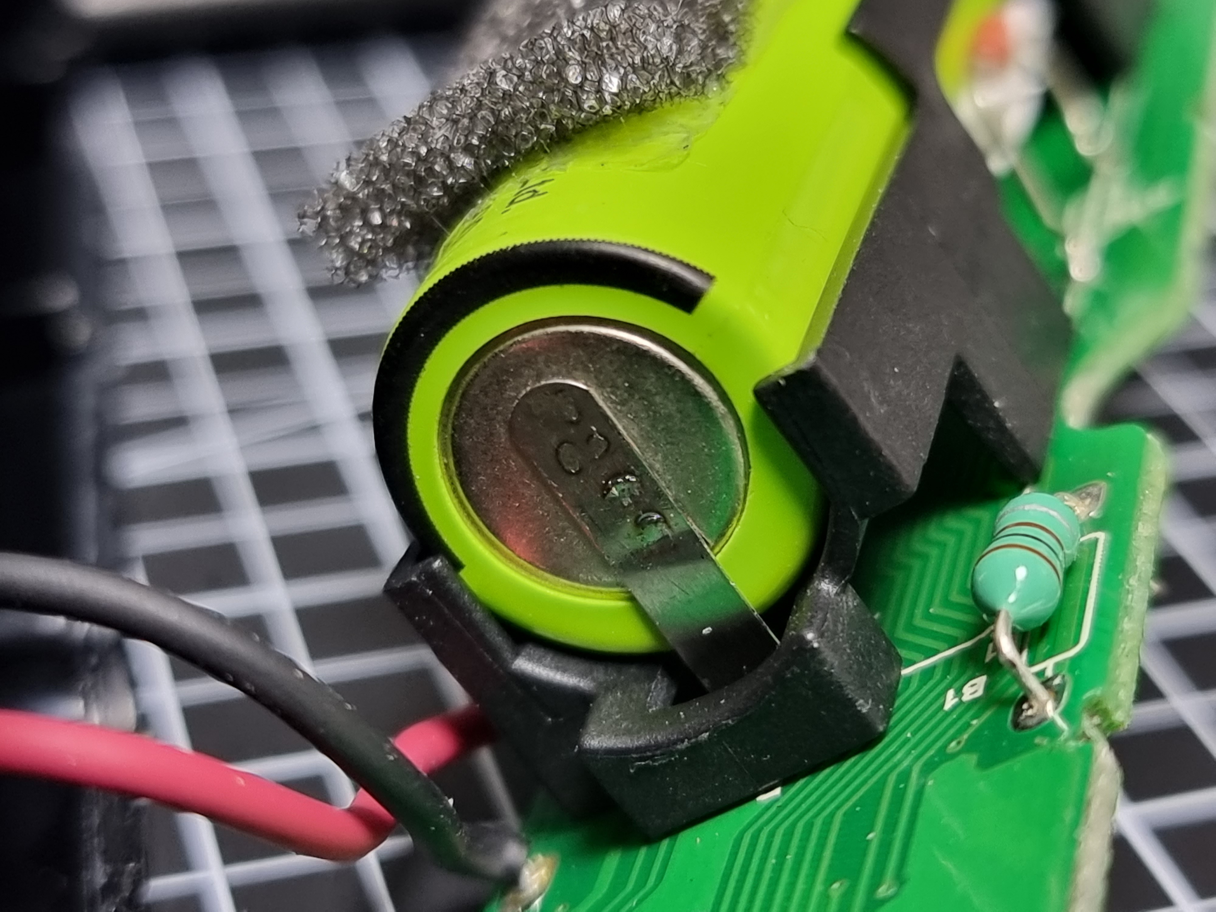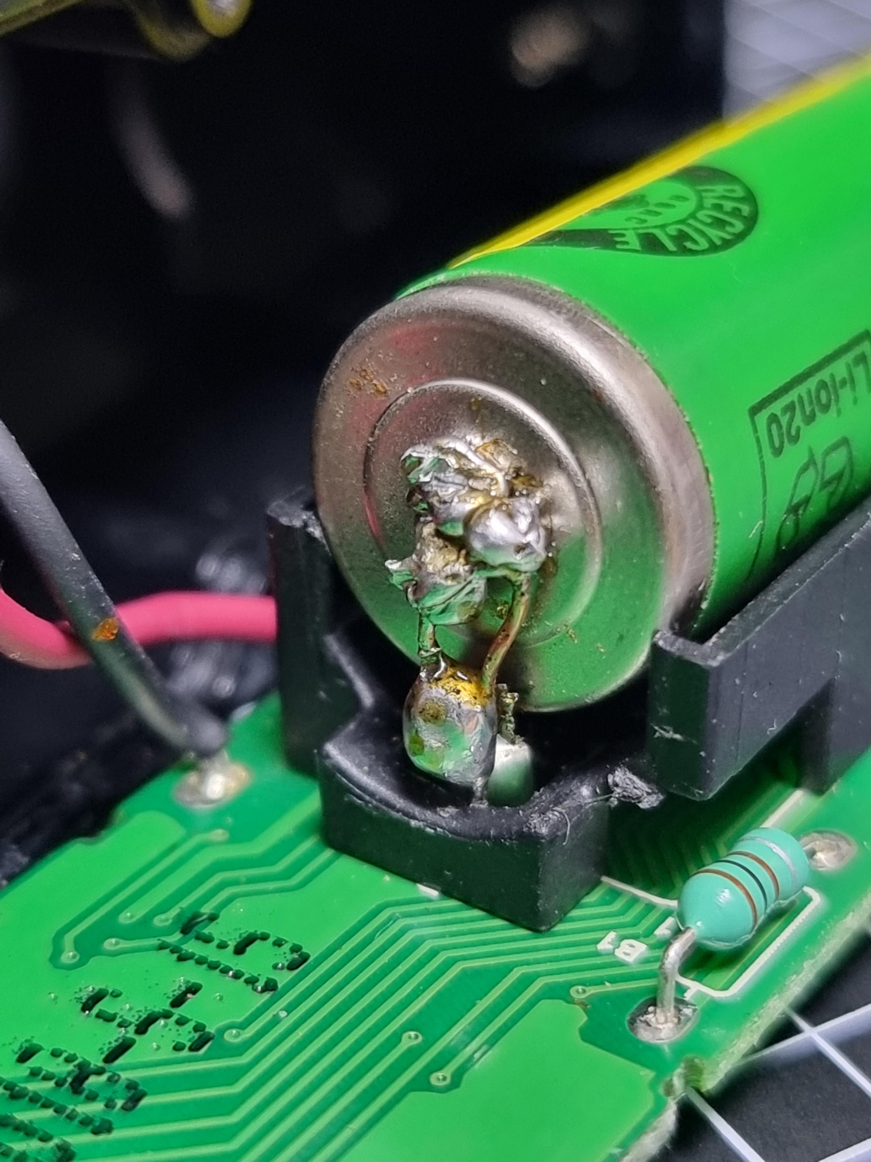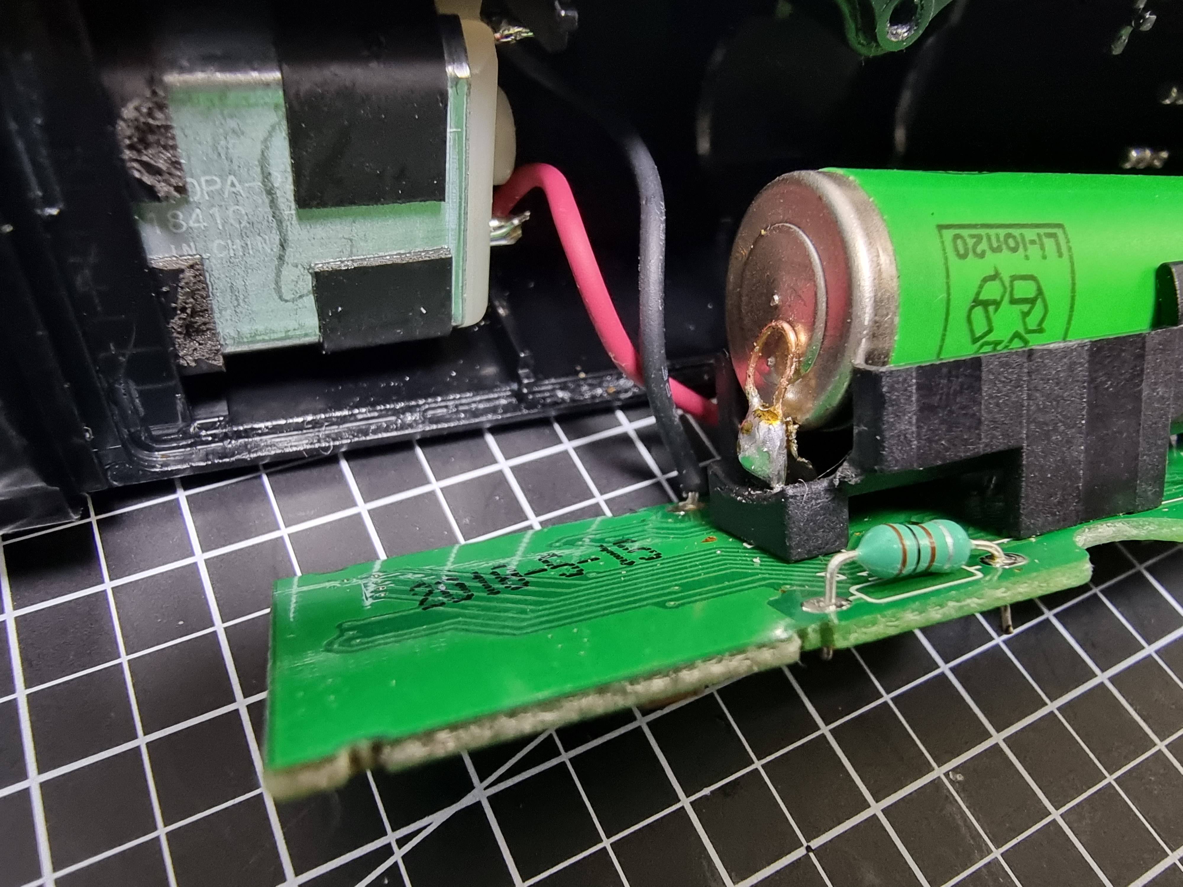 기판을 들어내면 뒤쪽에 스폿용접을 한 충전지가 보입니다
