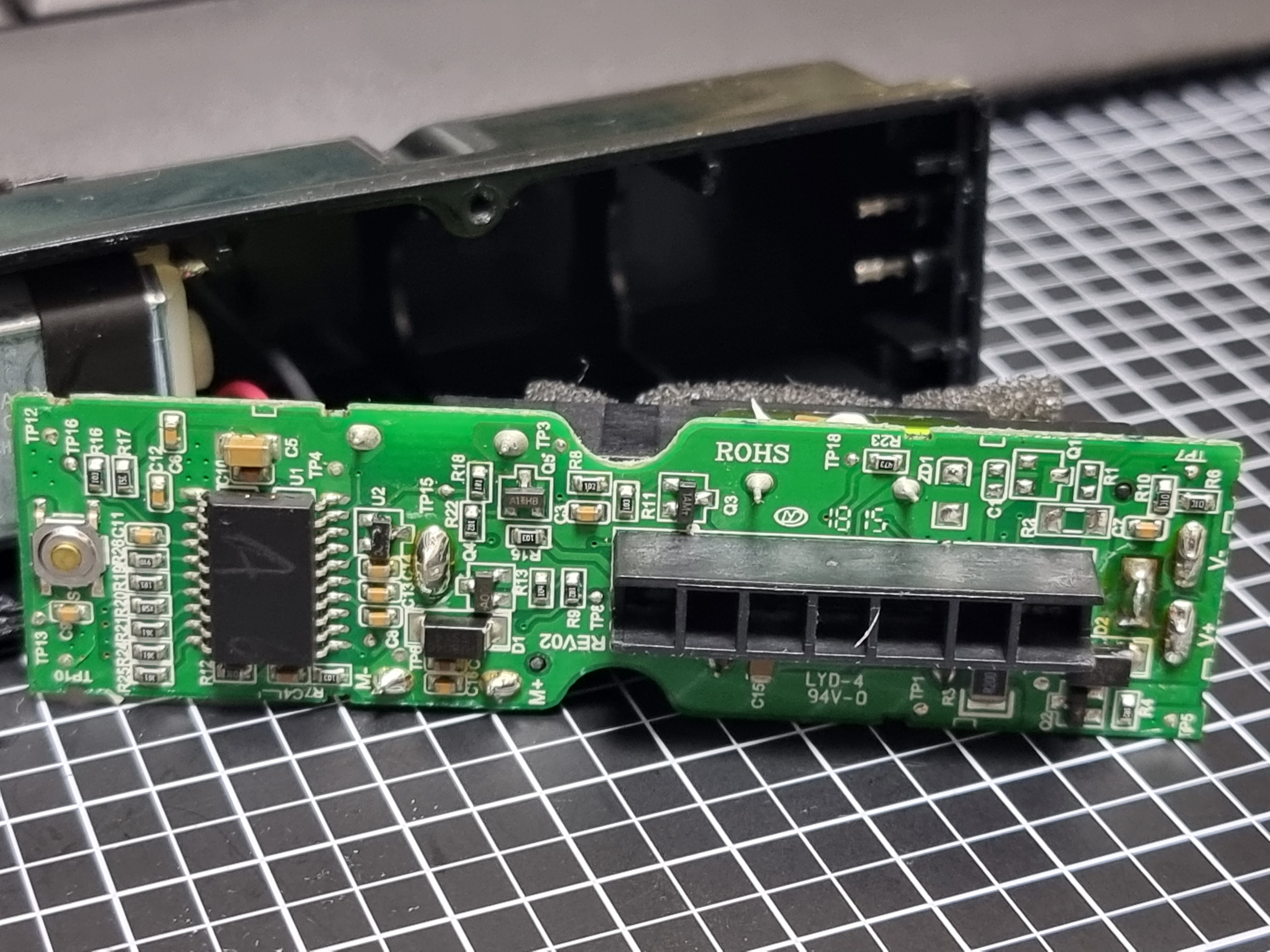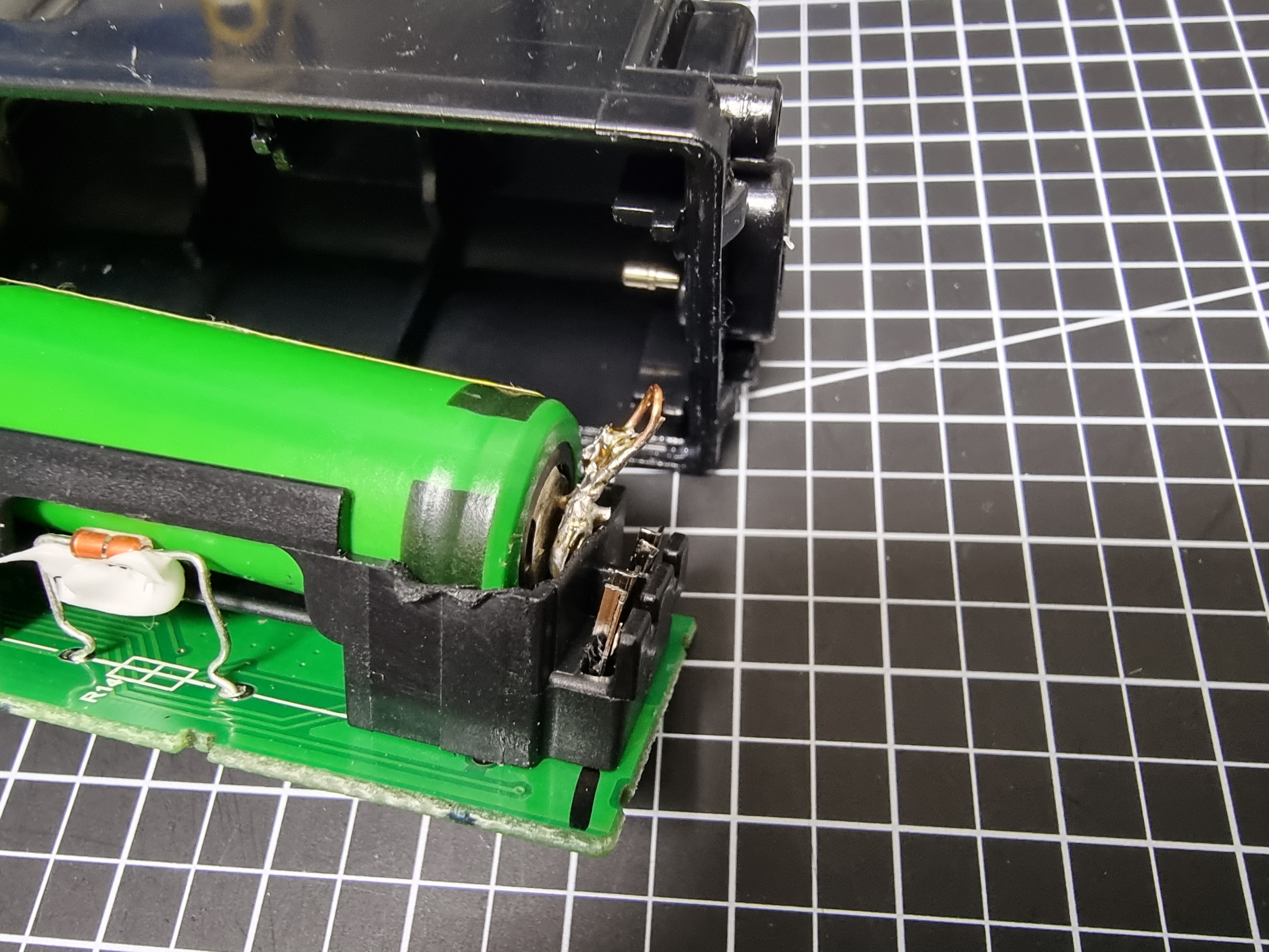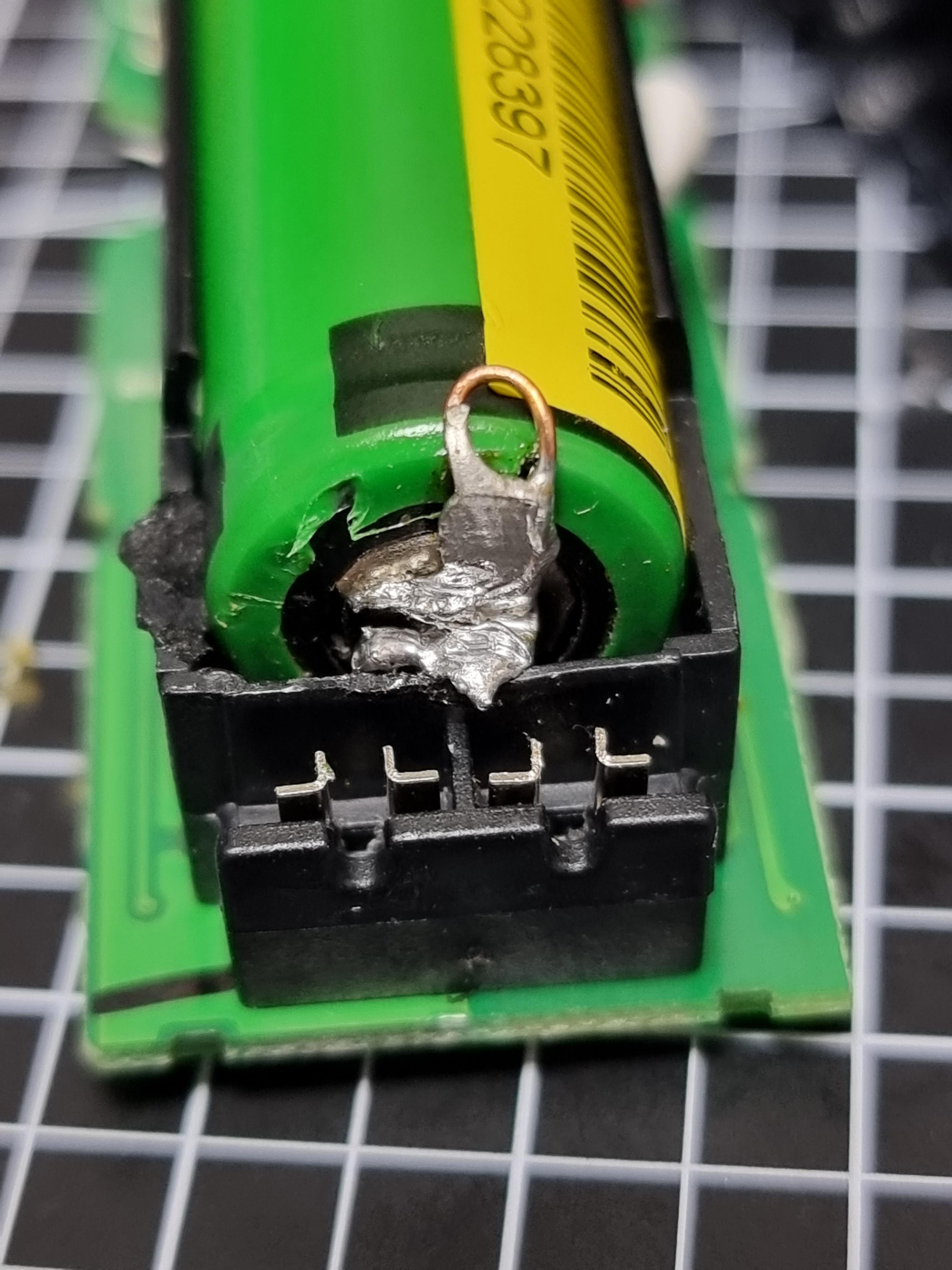 기판을 들어내면 뒤쪽에 스폿용접을 한 충전지가 보입니다