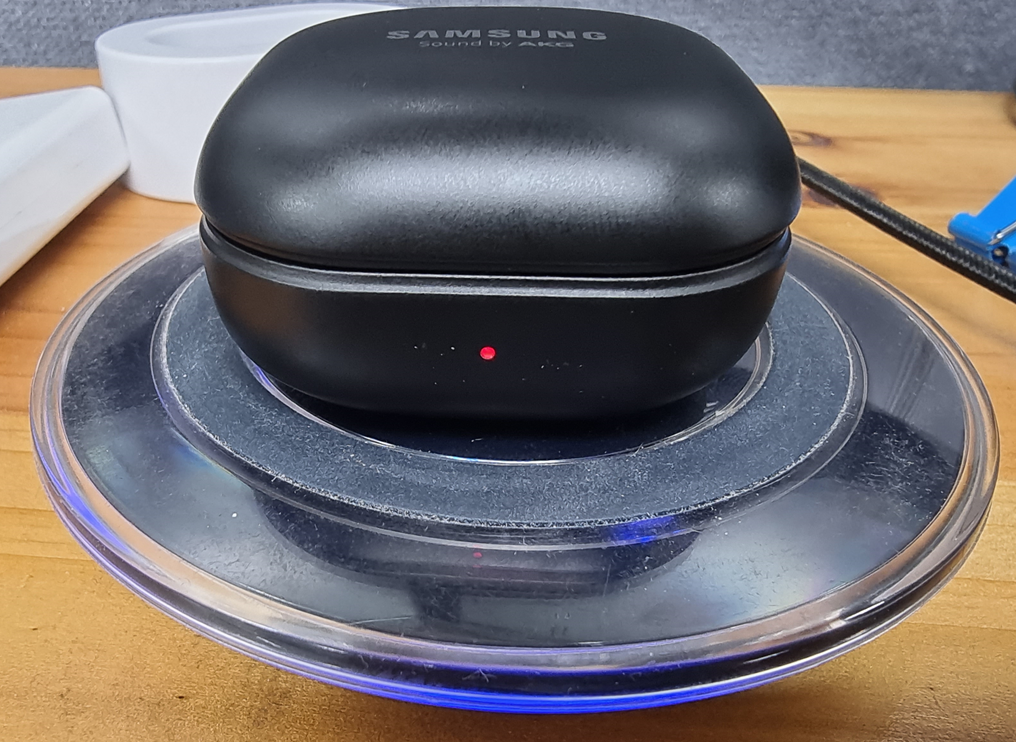 위 사진처럼 무선충전기 위에 올려놓으면 붉은 LED가 켜지면서 충전이 시작됩니다.