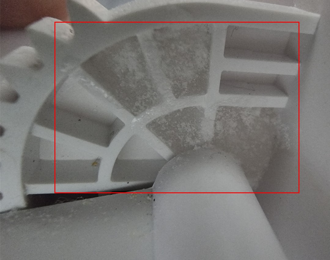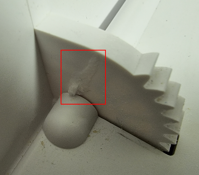 오랫동안 충격을 받아 플라스틱이 부러진것 같습니다 안쪽으로 톱니바퀴 구조물도 보입니다.