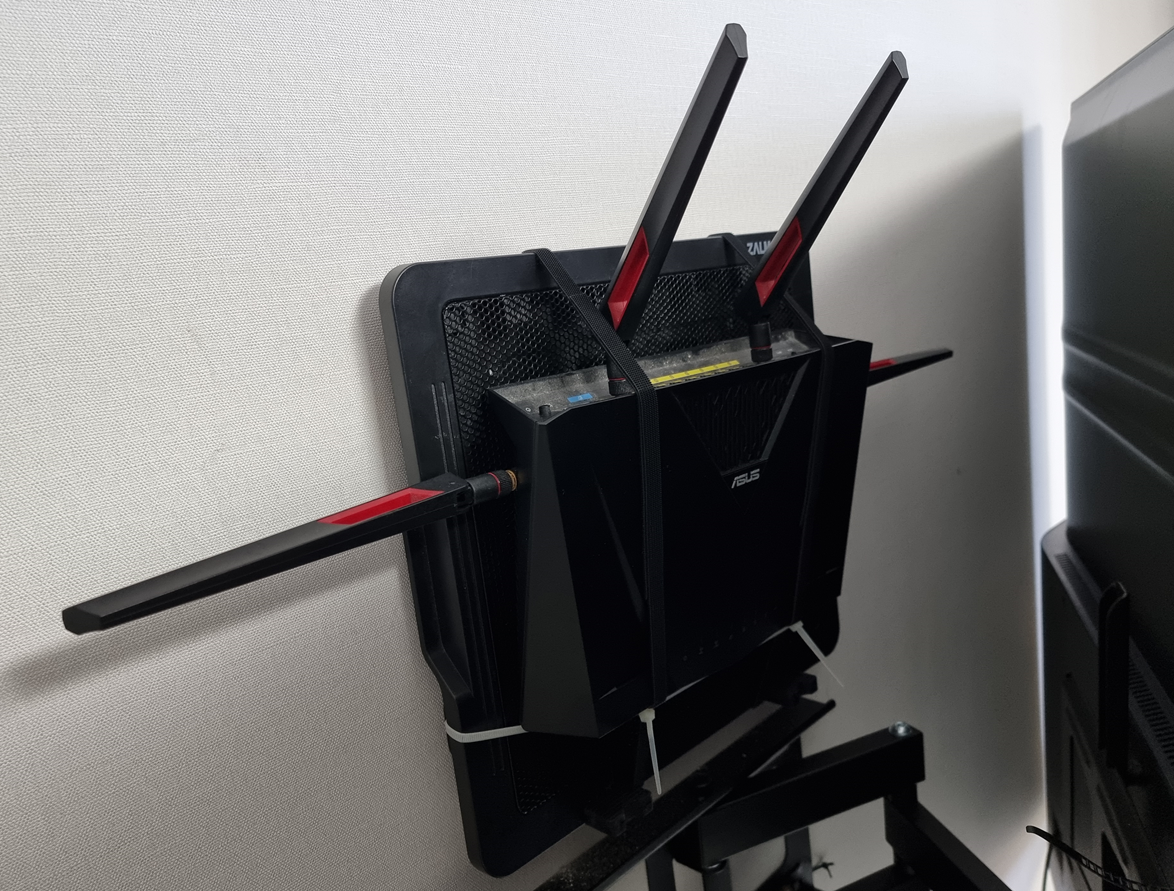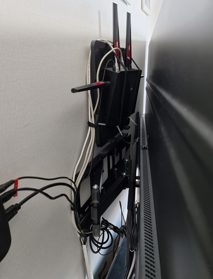 여러 번 수치를 재고 위치를 파악한 끝에 공유기를 TV 뒤의 벽에 거치하기로 합니다.