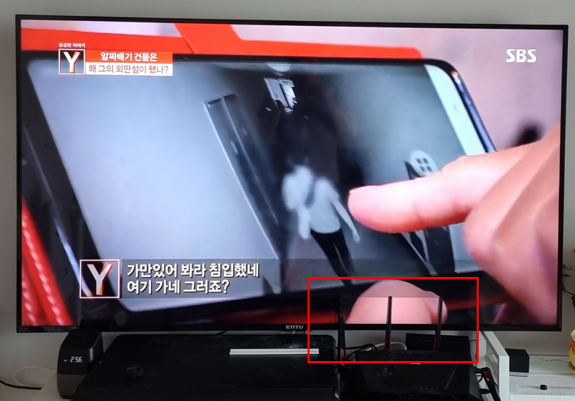 그 자리에 65인치 TV를 설치하니 공유기 안테나가 TV를 가립니다.