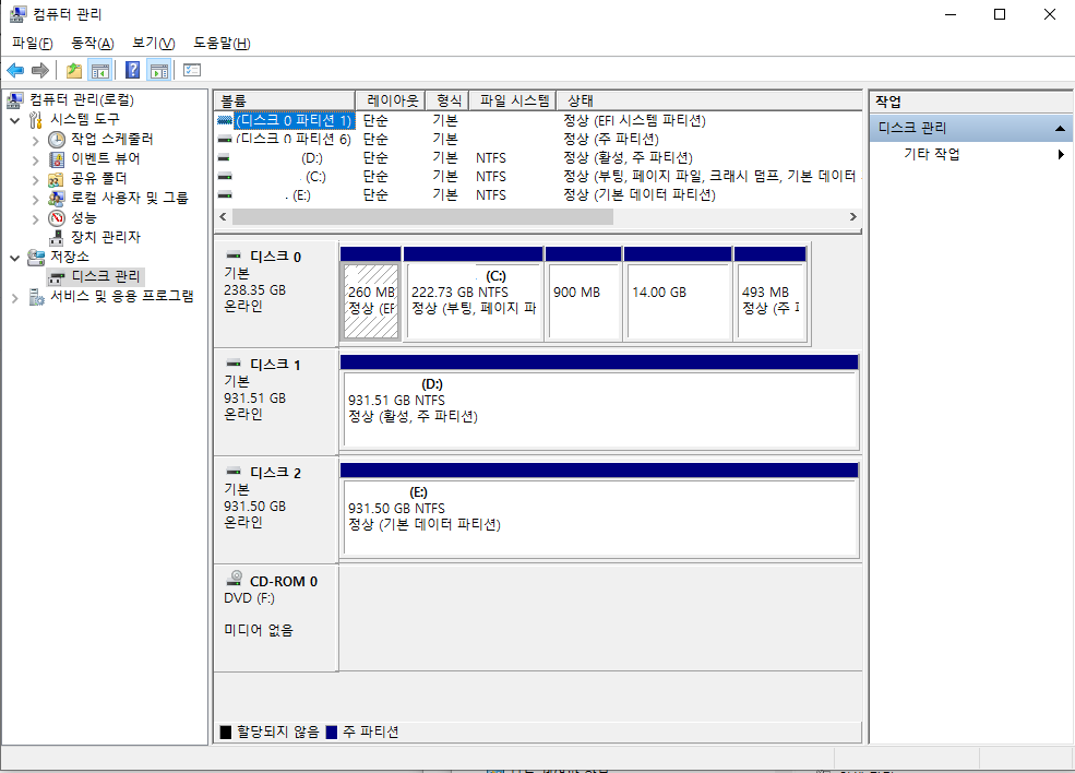 우선은 제어판-관리도구-컴퓨터관리-디스크관리에 가서