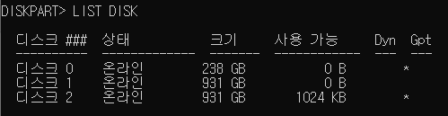 'LIST DISK'를 입력합니다. 현재 내 PC에 연결되어있는 디스크 목록이 출력됩니다.