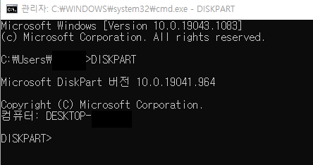 명령 프롬프트에서 'DISKPART'를 입력하고 엔터를 칩니다.
