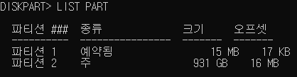 혹시 헷갈리는 경우 'LIST PART'명령어를 이용하여 디스크 안의 자세한 파티션 정보를 본다면 정확도가 올라가겠죠?