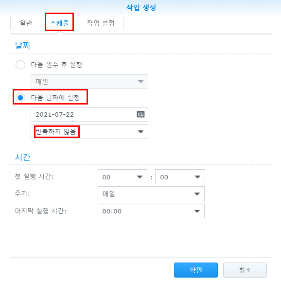3. 스케줄 탭에서 '다음 날짜에 실행'을 선택하고 '반복하지 않음'을 선택합니다.