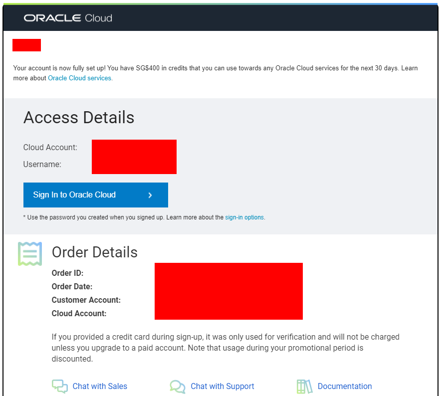 계정이 완전히 설정되었고 30일 동안 오라클 클라우드의 모든 서비스를 사용할 수 있도록 SG$400의 크레딧을 주었다 뭐 그런 내용이라고 합니다.(구글 번역기 가요)