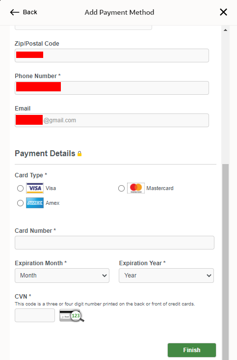 해외 결재가 가능한 신용 또는 체크카드를 입력하고 'Finish'버튼을 누릅니다.