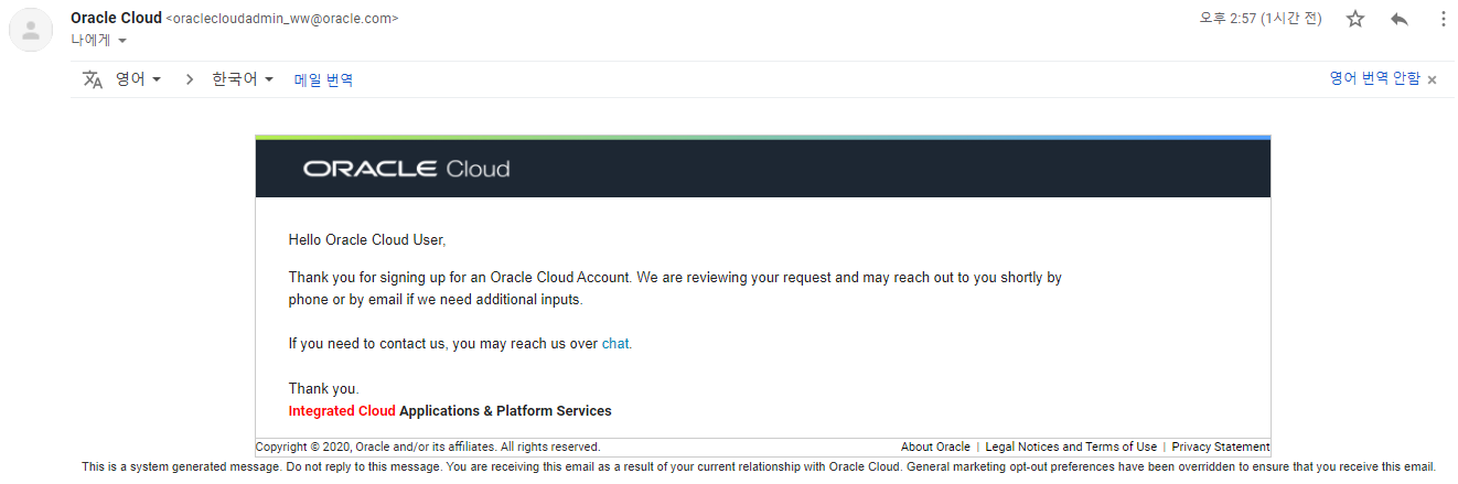 메일이 왔습니다. 영알못인 저는 이 이메일이 승인메일이고 chat라는 링크를 오라클 클라우드로 접속하는 링크인 줄 알고 누르려다가 웬 채팅? 하고 번역기를 돌려보기로 합니다.