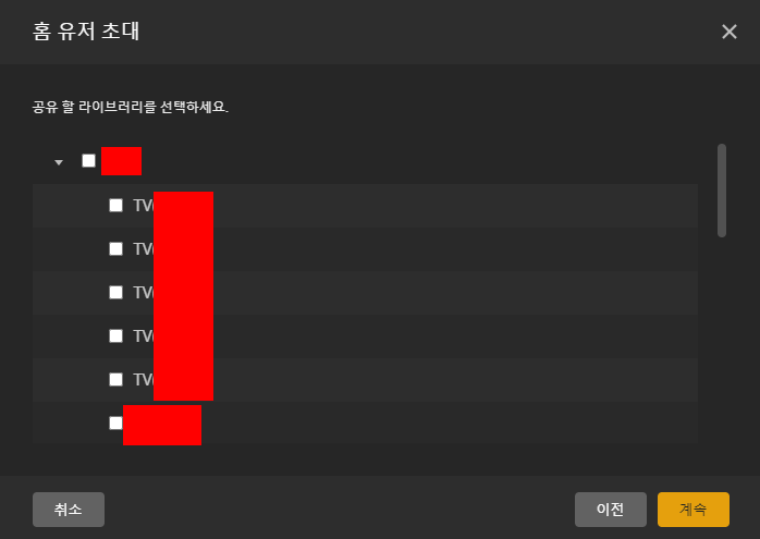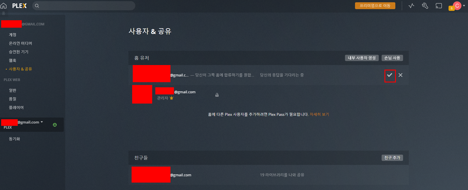 홈 유저를 초대하기 위해서는 상대방이 PLEX계정에 가입돼 있어야 합니다.(내부 사용자의 경우 가입할 필요는 없습니다.)