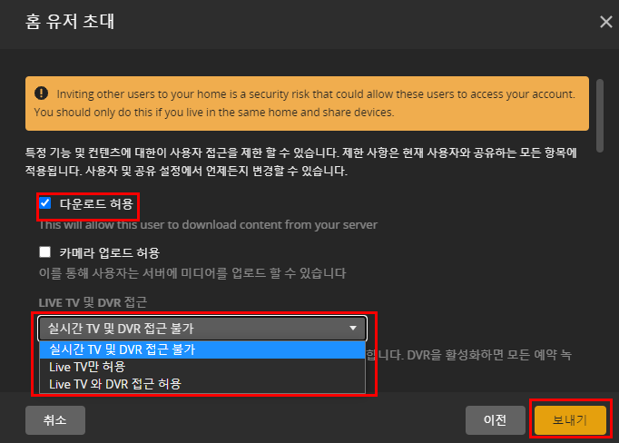 마지막으로 업, 다운로드 허용, DVR허용 등에 대한 항목을 체크, 선택 후 '보내기'버튼을 눌러 초대를 합니다.