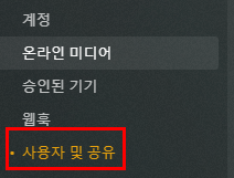 설정화면 왼편에 '사용자 및 공유'를 선택합니다.