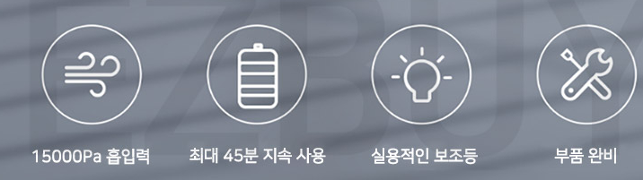 공식 소개자료에 보면 15,000Pa 흡입력, 최대 45분(강력모드 시 17분) 사용, 보조등, 부품 완비?라고 기재되어있고