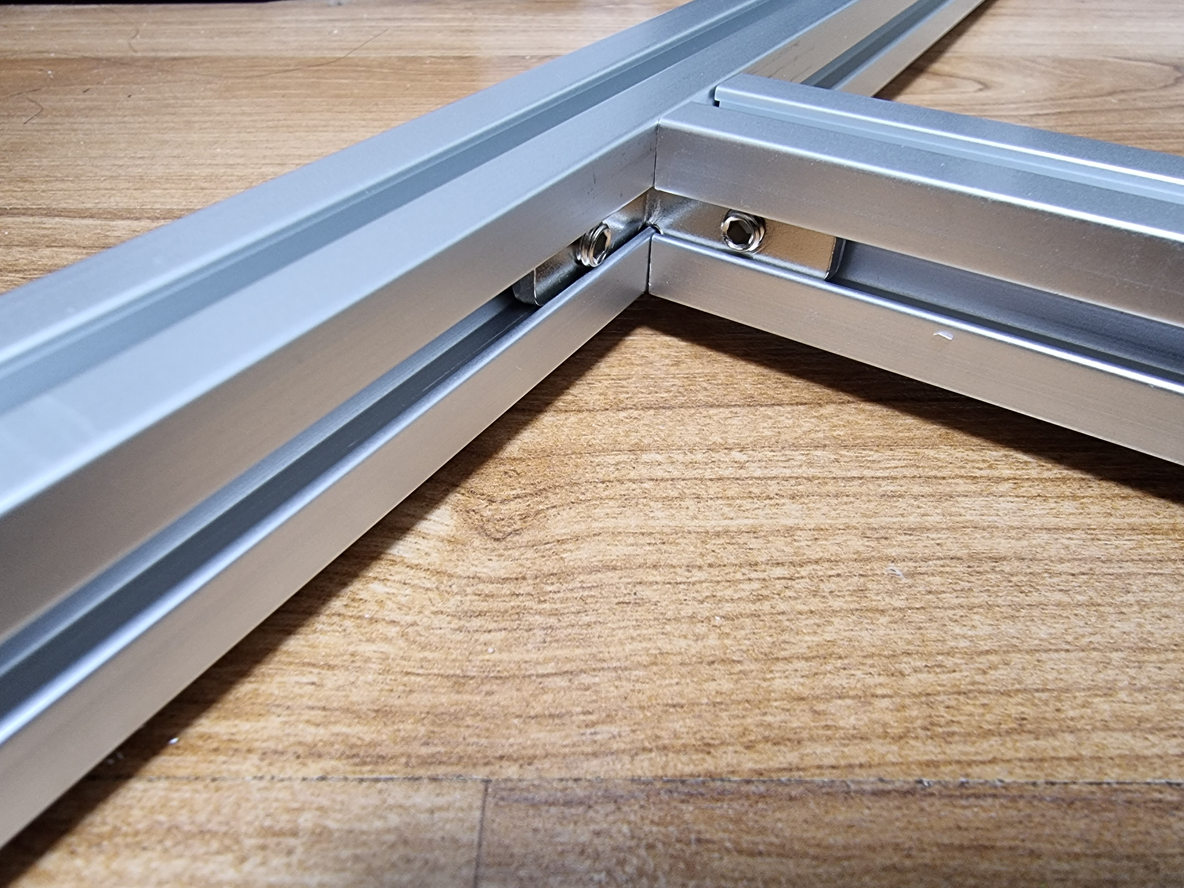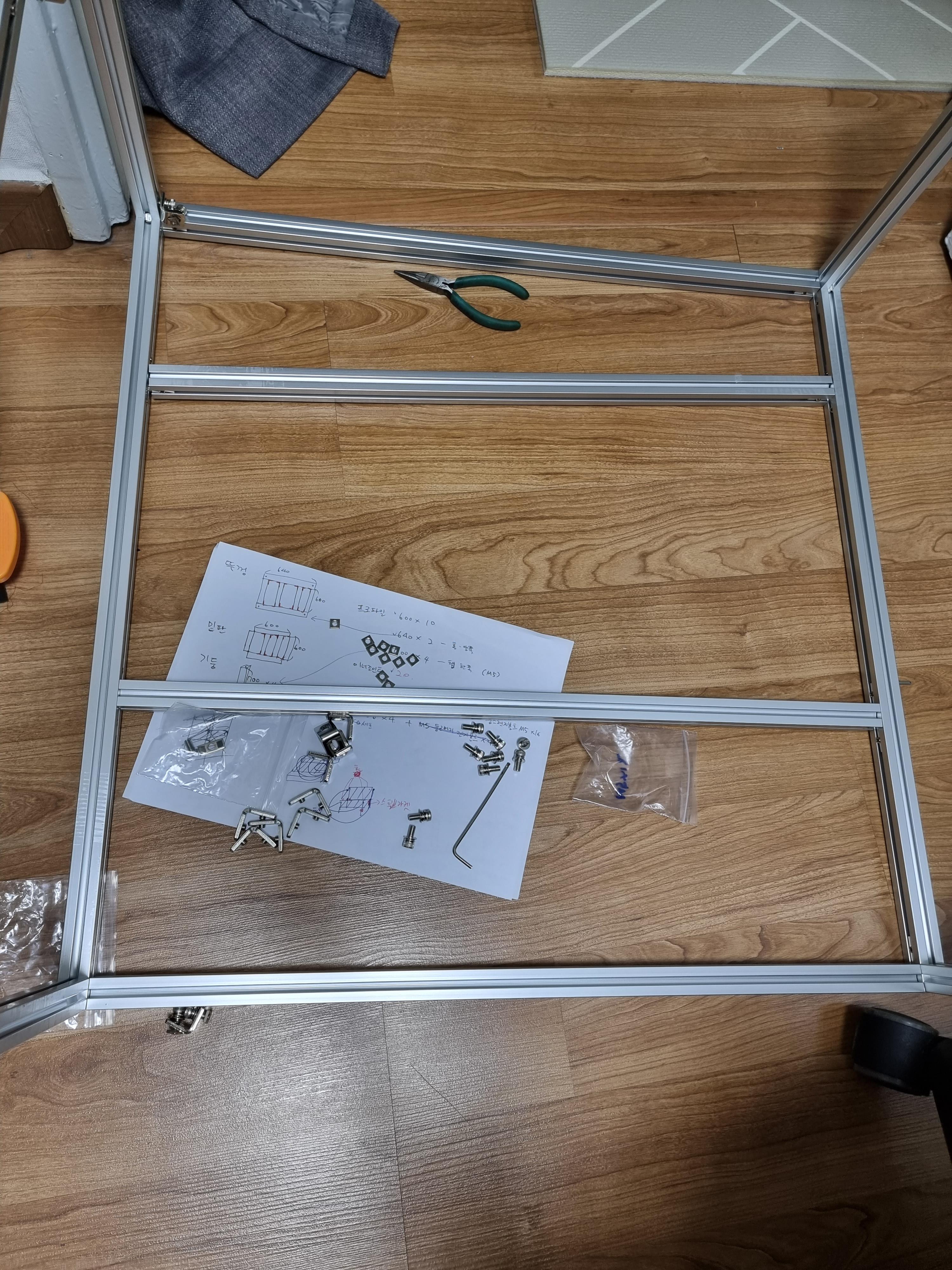 가운데 2개의 프로파일은 이동이 가능하도록 이너 브래킷을 이용하여 고정시켰습니다. 지금 바닥에 놓인 부분이 조립 후 상부가 될 부분입니다.